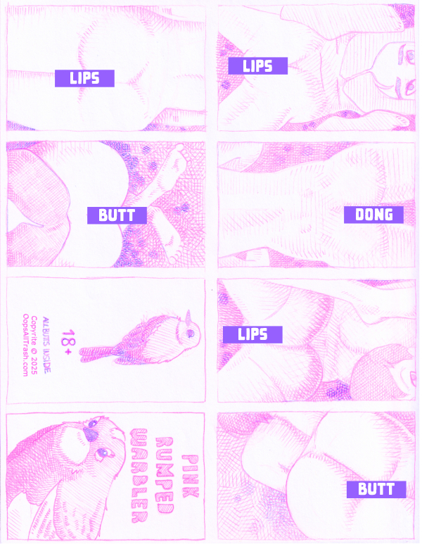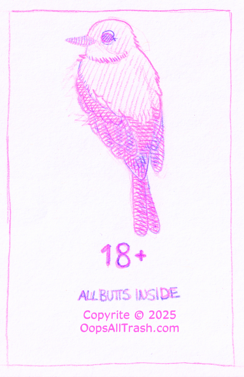A single page NSFW art zine of finely illustrated butts. Drawn with Pink and Violet Pilot Color Eno Neox Erasable Lead on the highest quality copy paper that could be found in my closet.